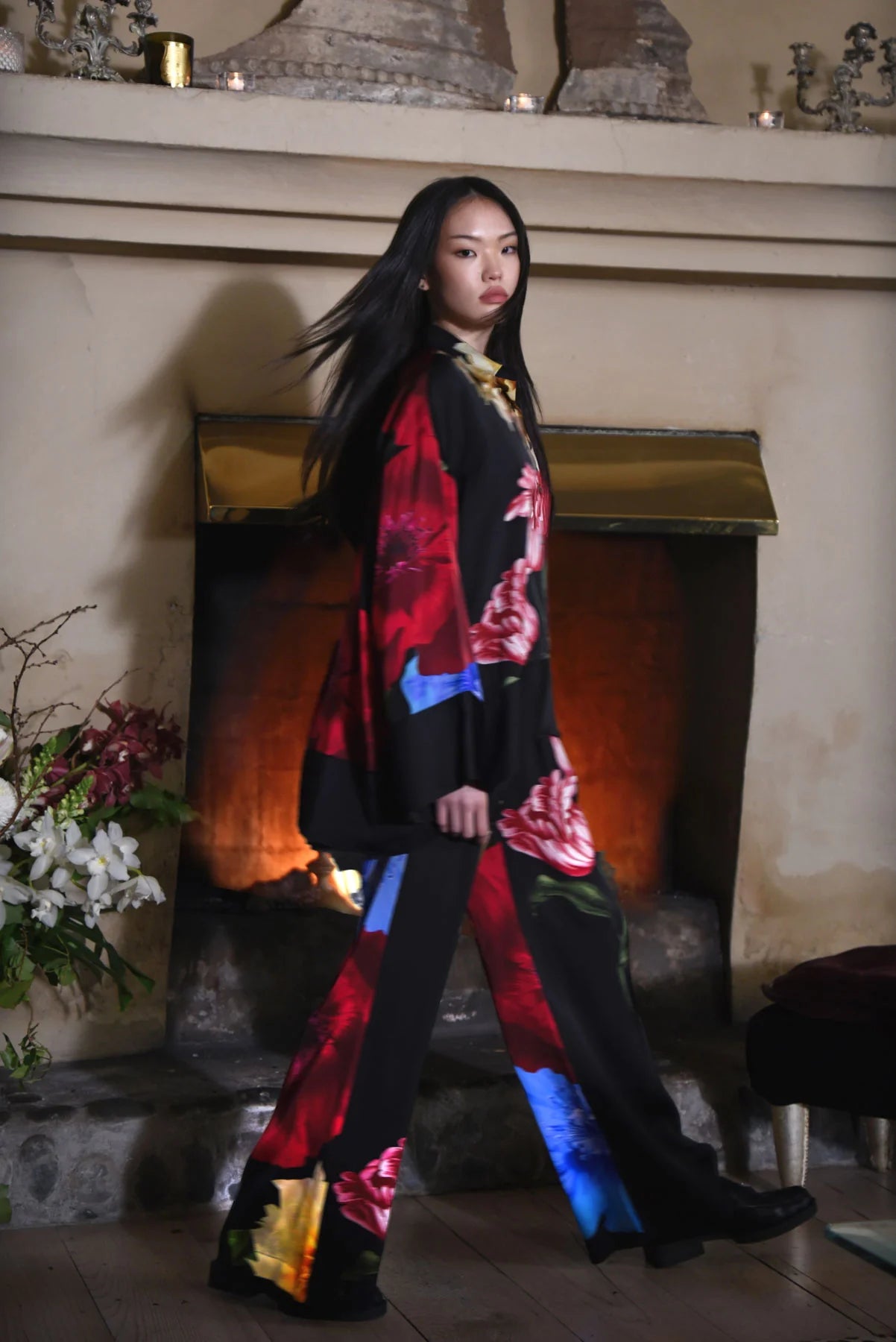 Bold florals take centre stage on the slinky 'Heavy Petals' viscose satin, making the 'Glossy Goddess' a statement piece for effortless elegance. Designed with a button-through front and a timeless collar, its wide cut sleeves flow gracefully into deep cuffs, while the tailored hem adds structure to this fluid silhouette. Perfect for both day and night, it blends classic tailoring with a modern, floral flourish.