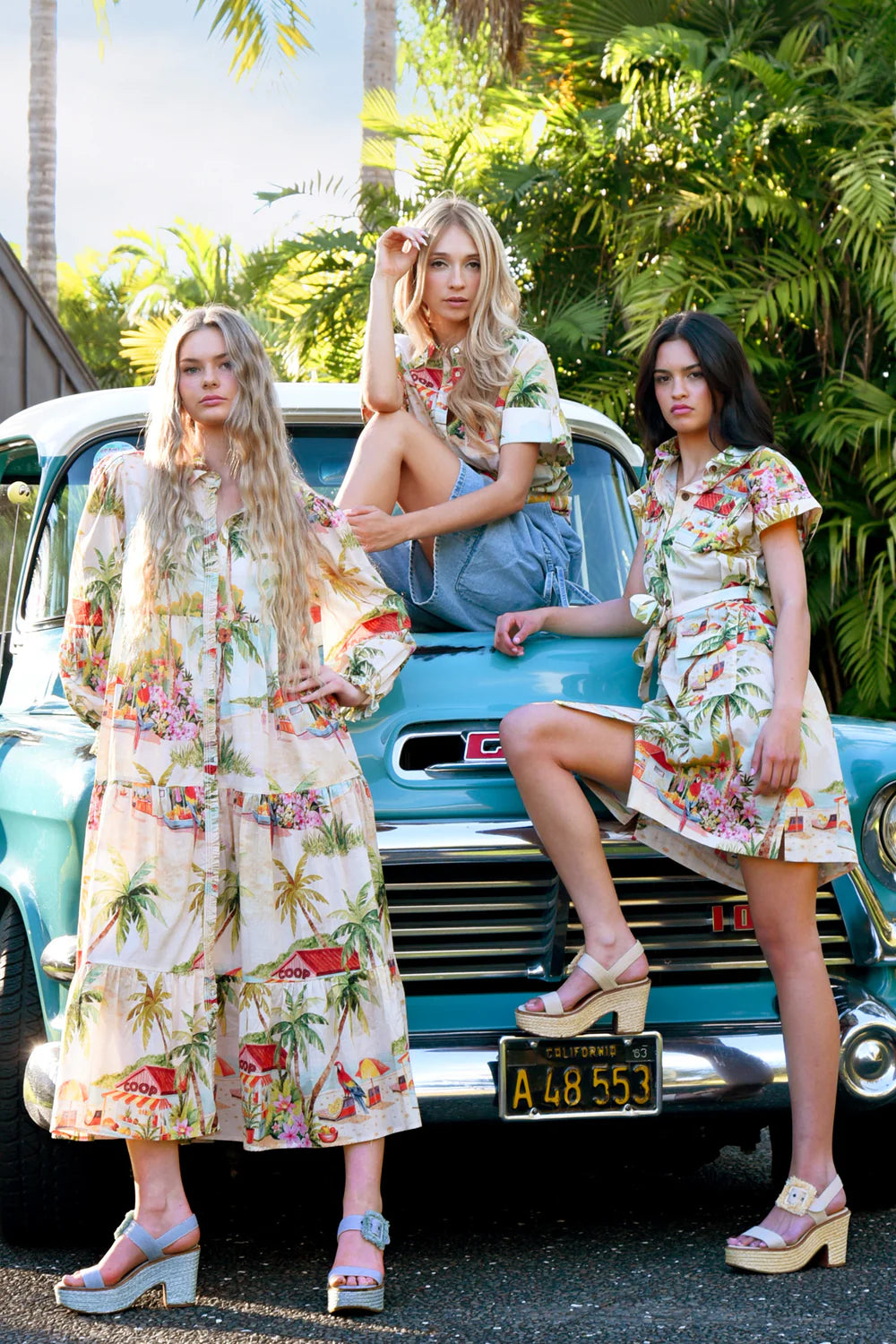 With a brand-new summer look, the ‘Picot-A-Boo’ dress is back this season. Crafted in the beach themed ‘Island Rewind’ cotton slub, this dress features a button through front with a ruffle trim placket, and a full tiered skirt creating soft and whimsical movement. A picot finished edge at the cuffs and button placket add a final intricate touch to this ever-wearable dress.