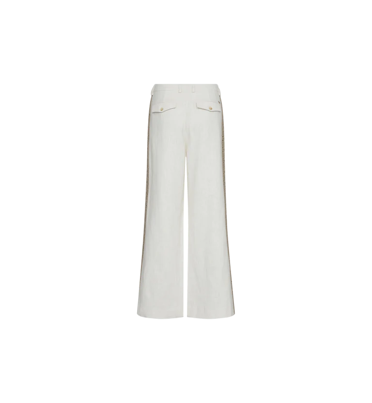 Achieve a sophisticated yet effortless look with these boxy-fit pants, designed with a high/mid-rise. Made from a blend of cotton and ramie for a structured, linen-like appearance, they feature delicate crochet tape along the sides, blending sporty and feminine elements. Pair them with the matching jacket for a cool, coordinated outfit.