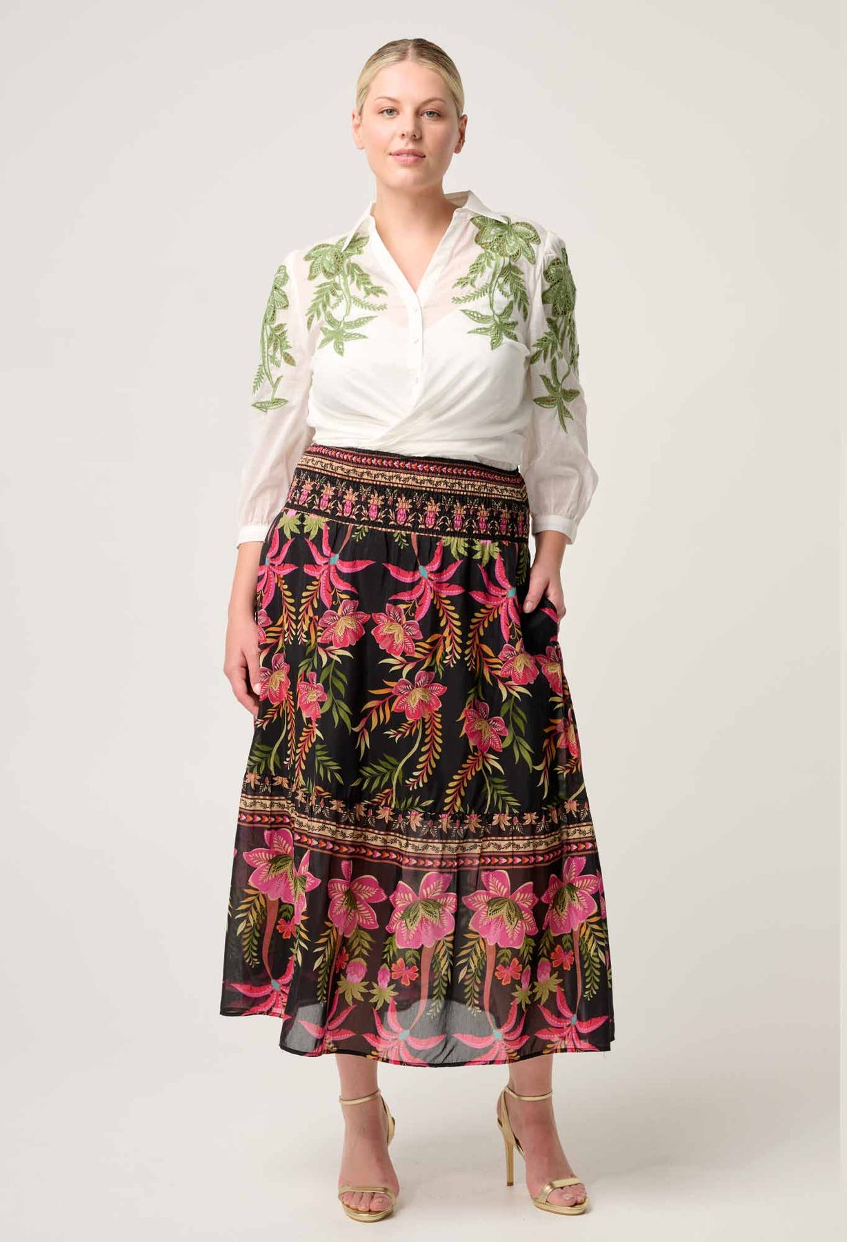 The relaxed silhouette is beautifully contrasted by bold, placement embroidery in rich green tones, inspired by tropical foliage. Thoughtfully positioned across the shoulders and sleeves, the embroidery adds a sophisticated, nature-inspired charm. A crisp collar and button-down front provide classic structure, while the soft, rolled sleeves and styling versatility offer effortless ease—from polished to laid-back.